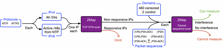 Many techniques have been introduced to measure network interference-tampering performed by nation-state censors or corporate firewalls to block unwanted traffic. However, virtually all prior measurement techniques require some degree of participation from endpoints within each country of study: including VPNs, cloud providers, or volunteers willing to run measurement software on their personal devices at their own risk. However, such endpoints are not always available in all countries that tamper with connections, leaving many networks unmeasurable.